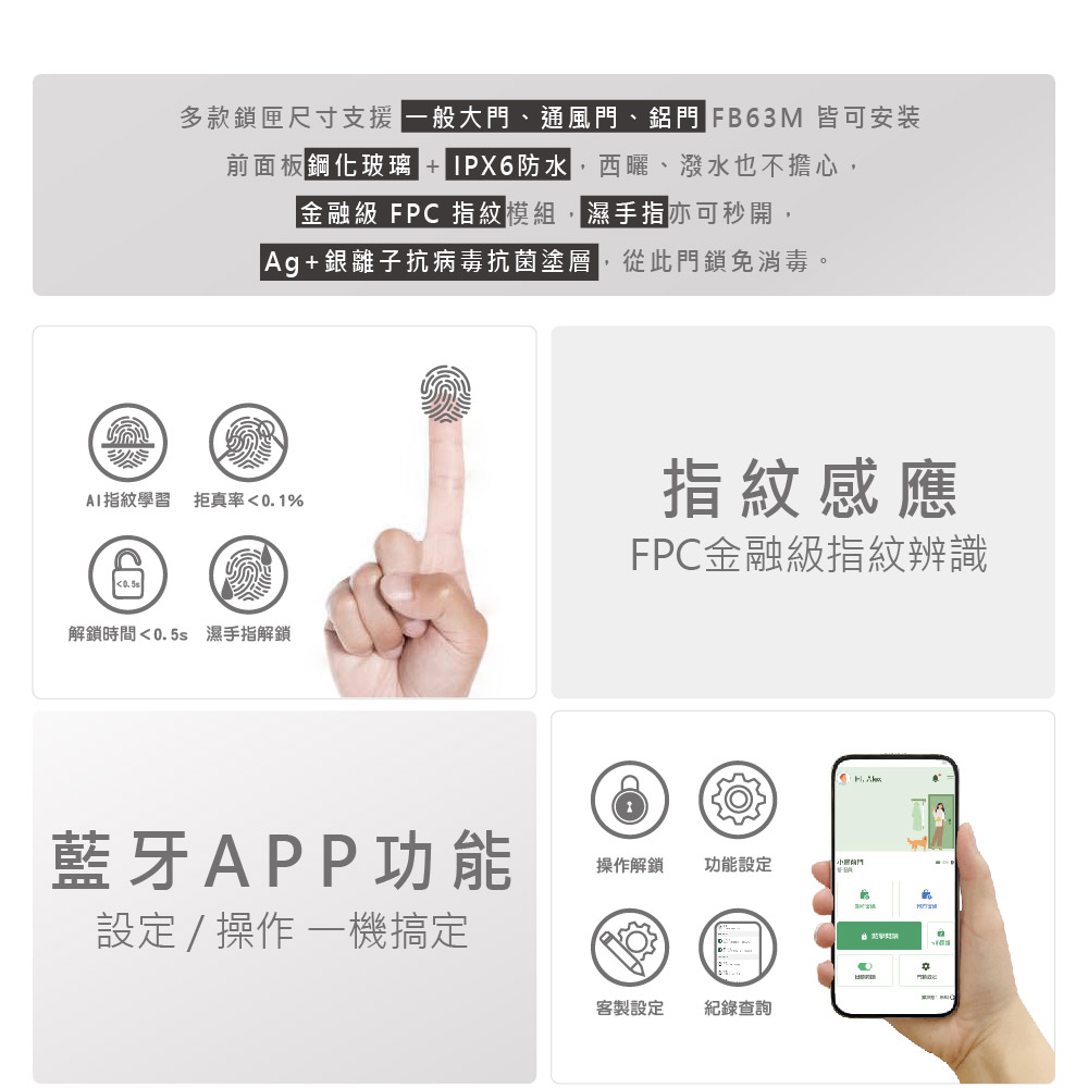 FIBER琺博智慧電子鎖,通風門、橫拉門救星「FB63M精簡」,完美解決窄框門扇無法裝電子鎖得困擾! 全機達室外級防水係數,戶外露天環境也能安裝;輕鬆告別傳統鎖,窄框門也能一機實現指紋解鎖等智慧開鎖功能。