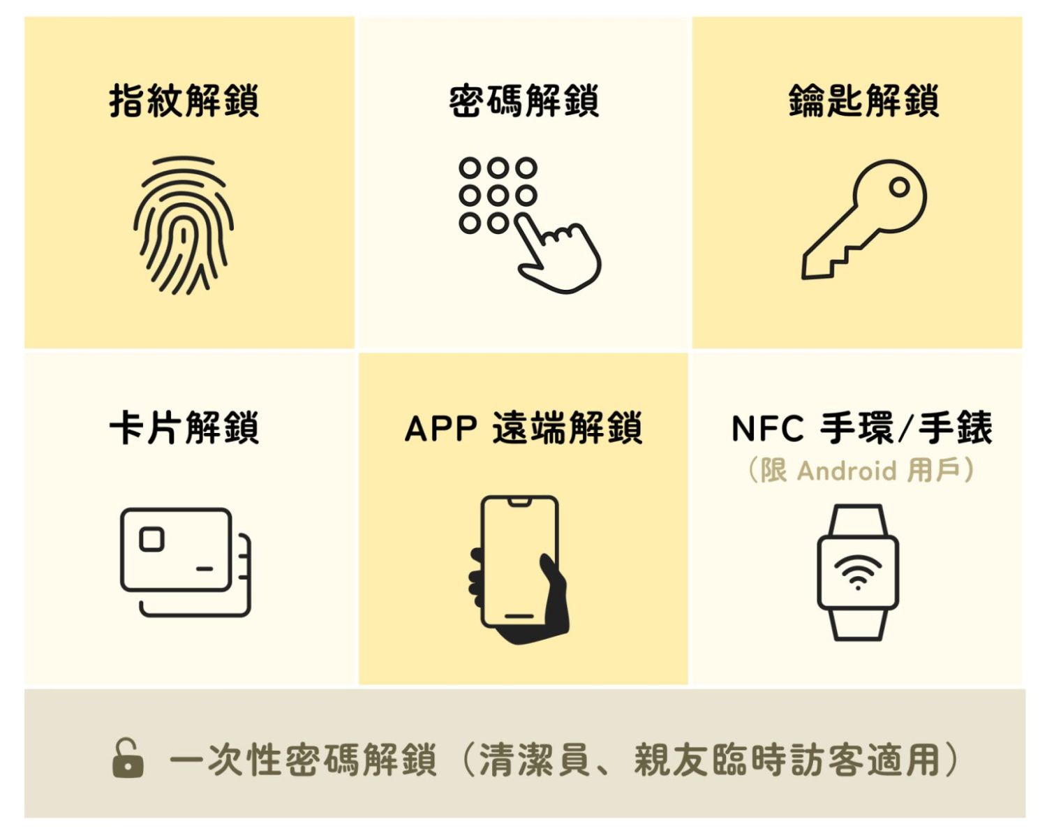 小島快鎖 F 不只支援 七種解鎖方式(指紋、密碼、感應卡、NFC 手環、一次性密碼、App 遠端、實體鑰匙),還搭載全球唯一防潮晶片與防靜電設計,專為台灣氣候與家庭需求打造。無論是家中長輩、孩子,或需要遠端協助開門的時刻,都能輕鬆、安心又便利!