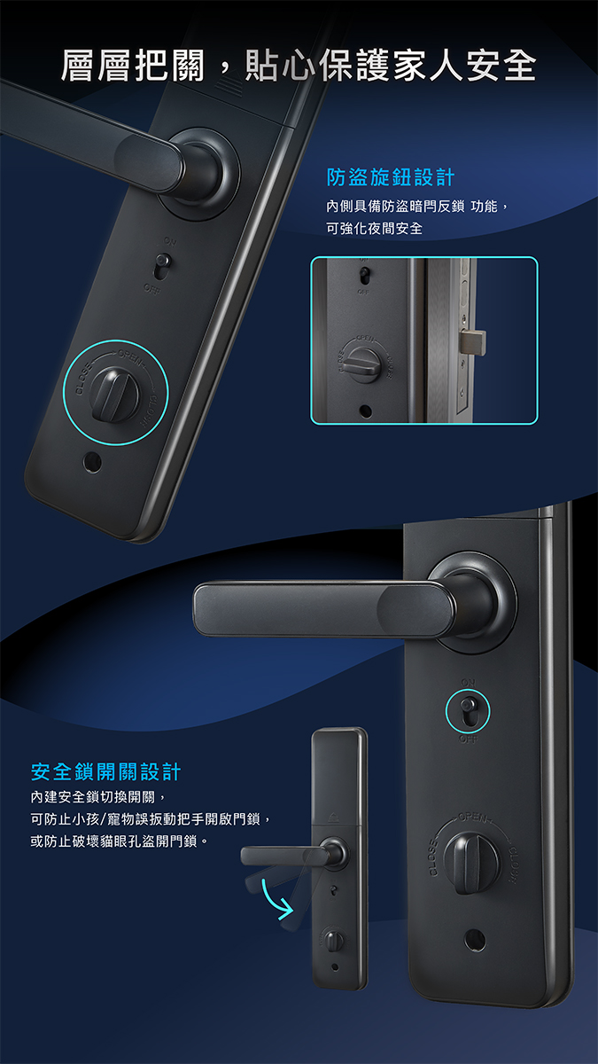 內把手安全鎖功能: 可防由門外盜開,或兒童/寵物誤壓把手開鎖